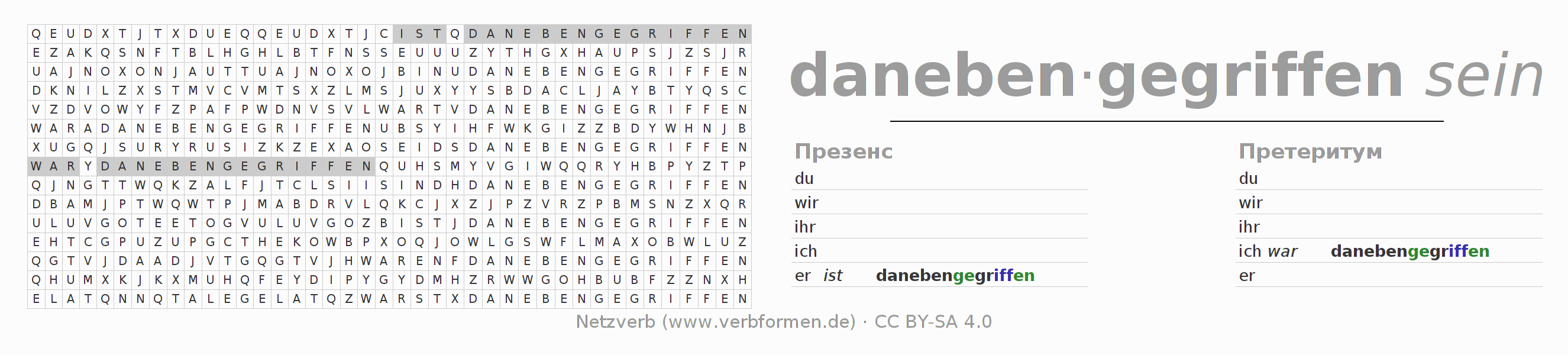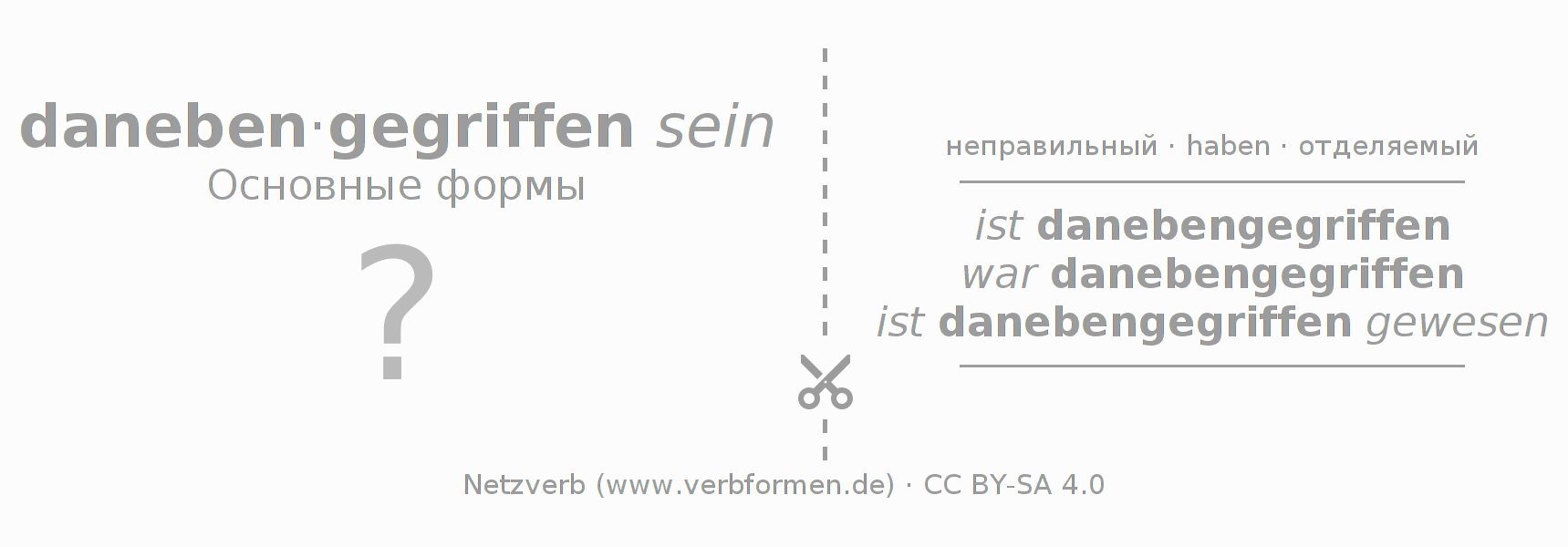 Глагольные таблицы, содержащие все формы глагола danebengreifen, для наглядности объединены в одну общую таблицу.