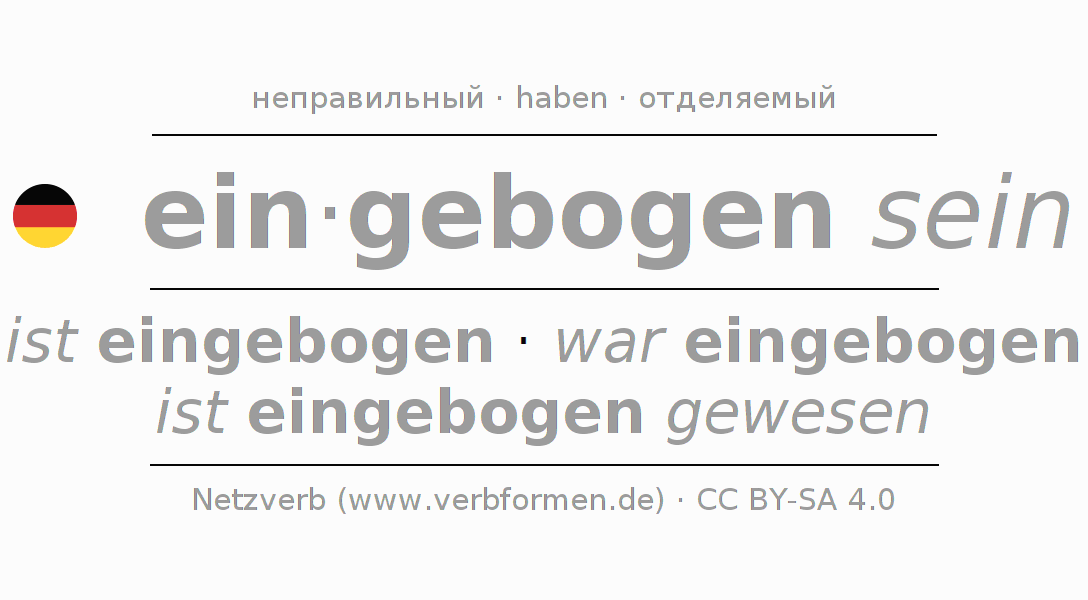 Глагольные таблицы, содержащие все формы глагола einbiegen, для наглядности объединены в одну общую таблицу.