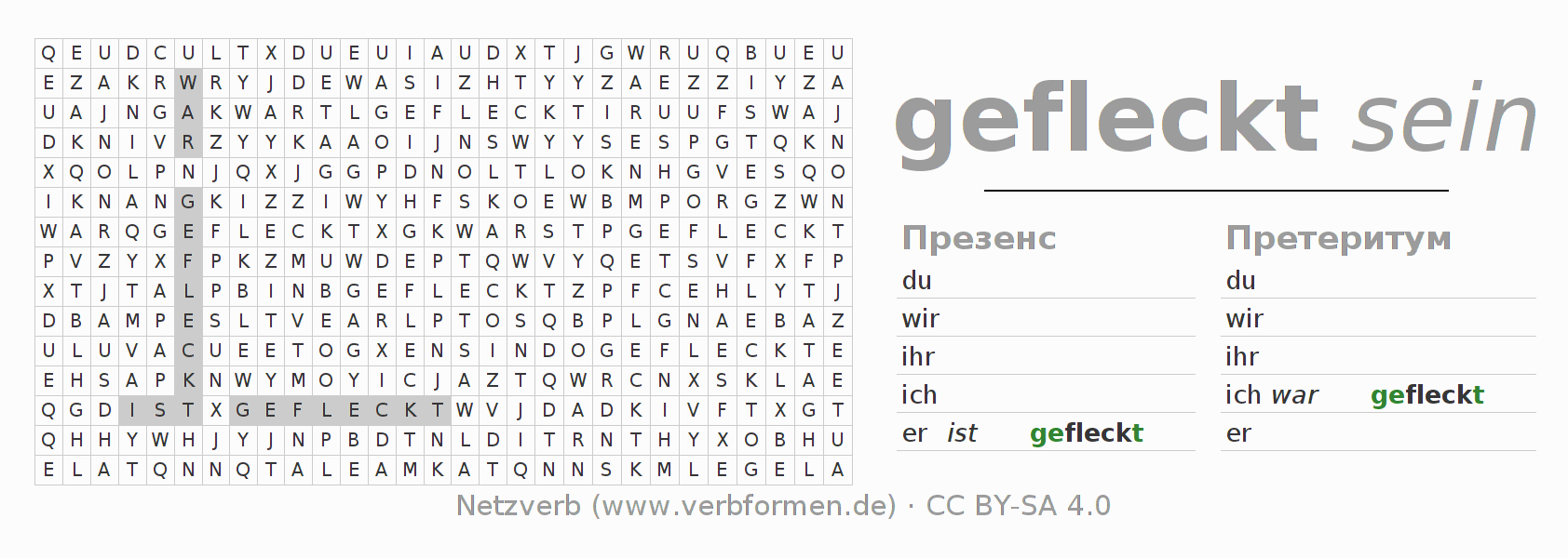 С помощью этих головоломок по поиску слов Вы можете подходящим для Вас способом изучать спряжение немецкого глагола flecken.