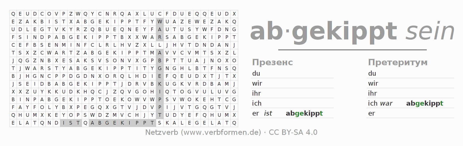 С помощью этих головоломок по поиску слов Вы можете подходящим для Вас способом изучать спряжение немецкого глагола abkippen.
