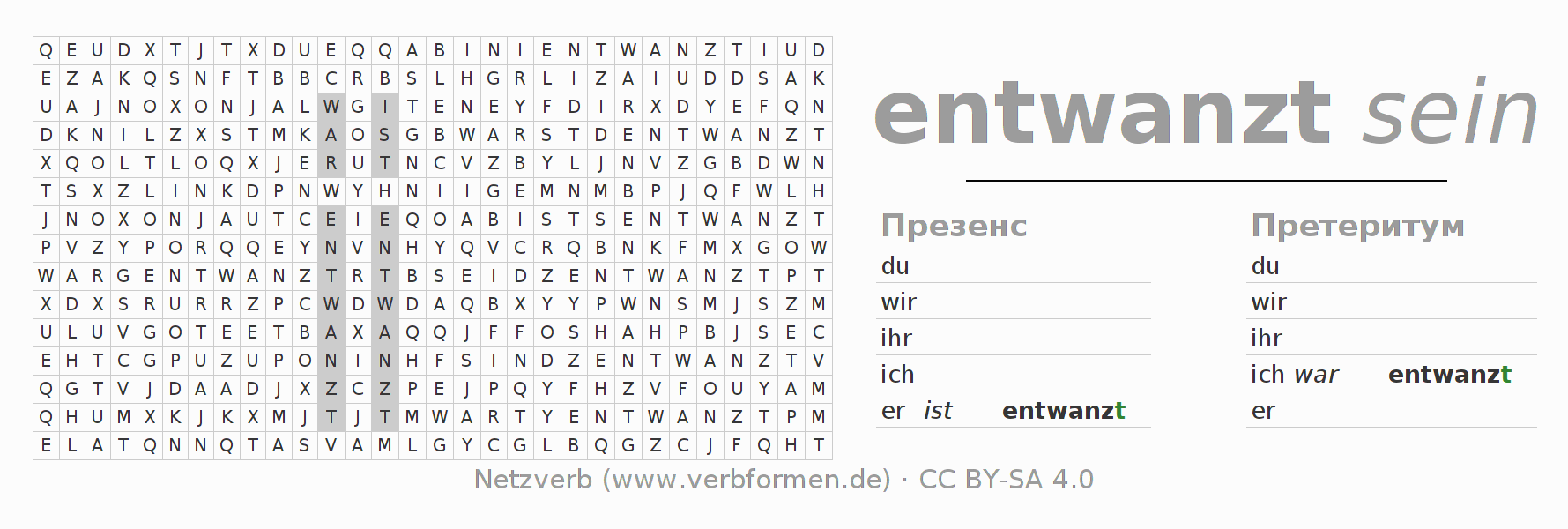 Глагольные таблицы, содержащие все формы глагола entwanzen, для наглядности объединены в одну общую таблицу.