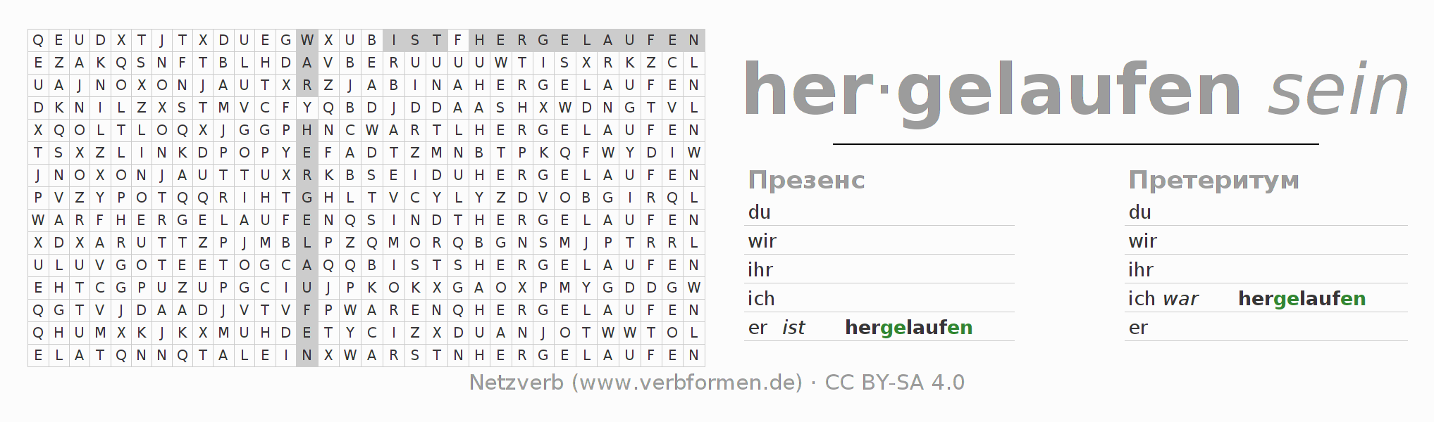 С помощью этих головоломок по поиску слов Вы можете подходящим для Вас способом изучать спряжение немецкого глагола herlaufen.