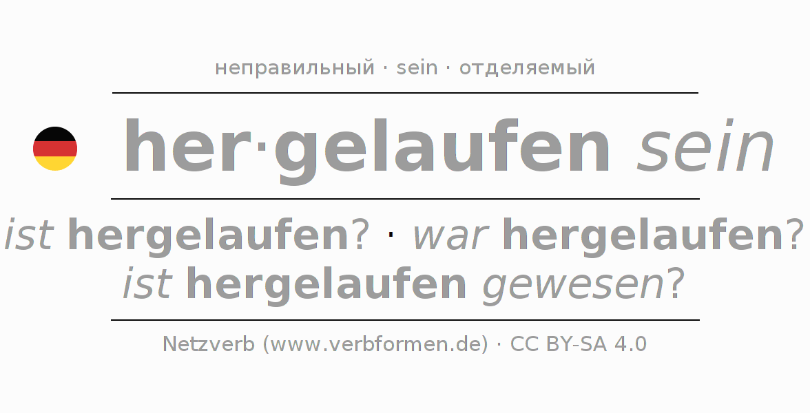 Глагольные таблицы, содержащие все формы глагола herlaufen, для наглядности объединены в одну общую таблицу.