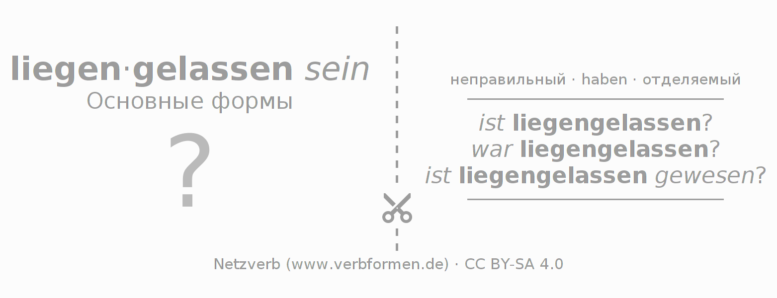 С помощью обучающих карточек можно эффективно и удобно изучать и запоминать глагольные формы liegenlassen. Обучающие карточки можно распечатать в формате PDF и вырезать.