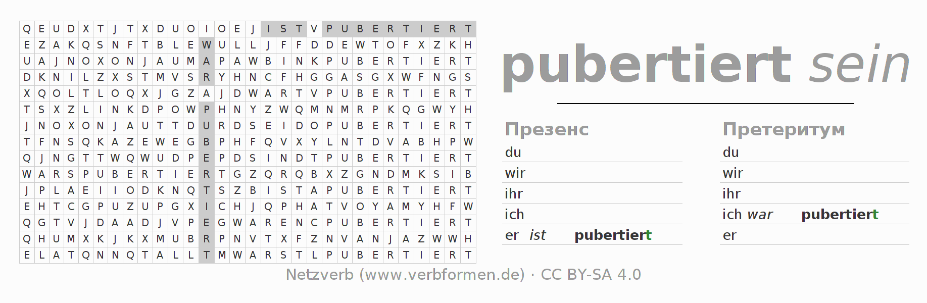 С помощью этих головоломок по поиску слов Вы можете подходящим для Вас способом изучать спряжение немецкого глагола pubertieren.