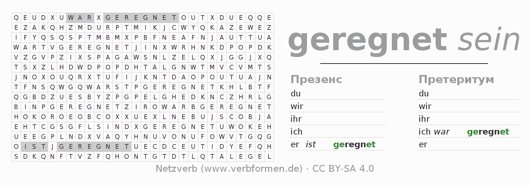 С помощью этих головоломок по поиску слов Вы можете подходящим для Вас способом изучать спряжение немецкого глагола regnen.