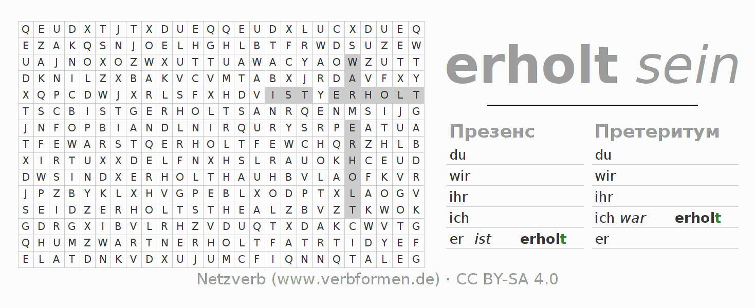 С помощью этих головоломок по поиску слов Вы можете подходящим для Вас способом изучать спряжение немецкого глагола sich erholen.