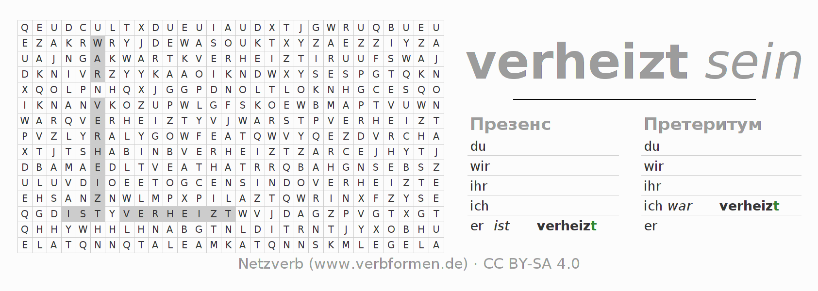 С помощью этих головоломок по поиску слов Вы можете подходящим для Вас способом изучать спряжение немецкого глагола verheizen.