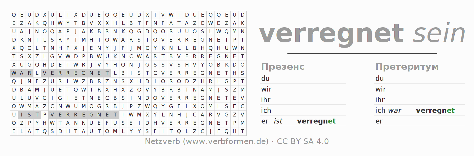 С помощью этих головоломок по поиску слов Вы можете подходящим для Вас способом изучать спряжение немецкого глагола verregnen.