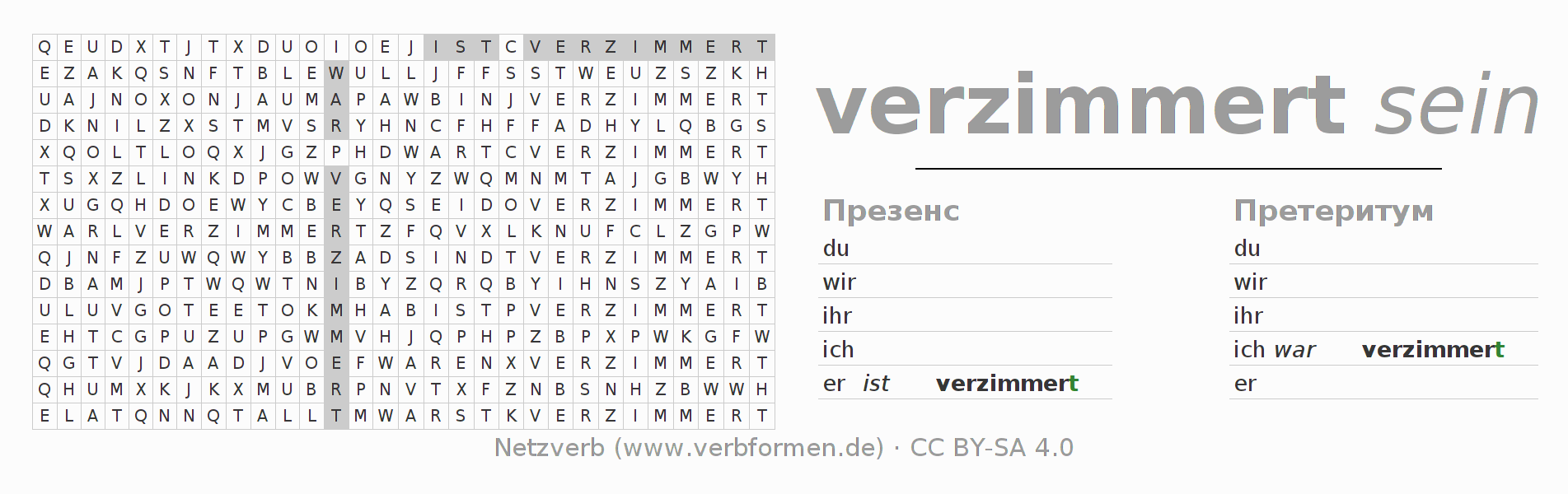 С помощью этих головоломок по поиску слов Вы можете подходящим для Вас способом изучать спряжение немецкого глагола verzimmern.