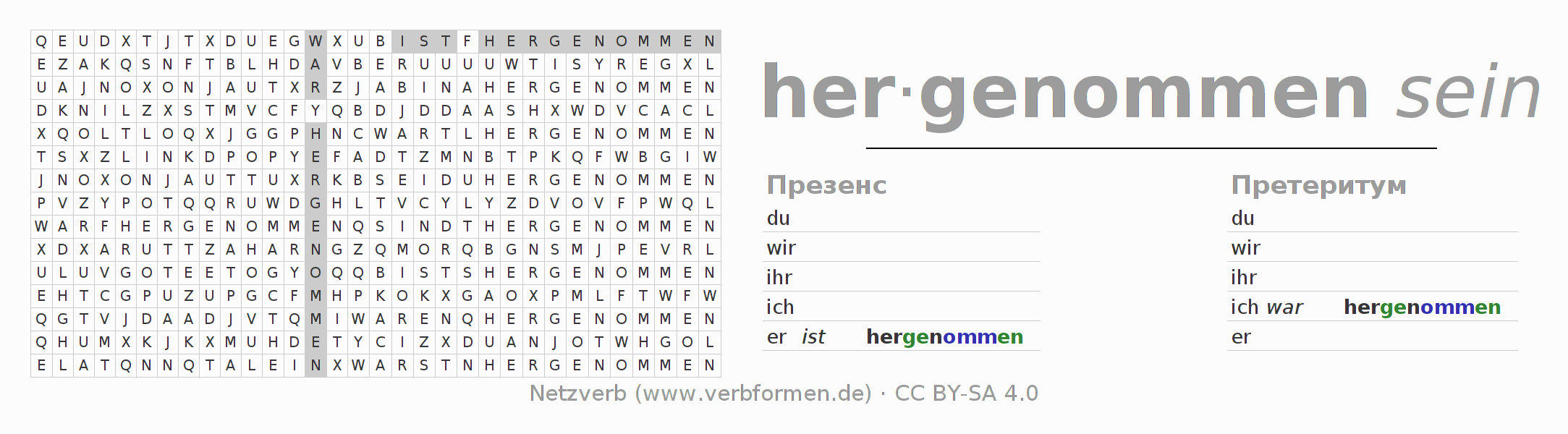 С помощью этих головоломок по поиску слов Вы можете подходящим для Вас способом изучать спряжение немецкого глагола hernehmen.