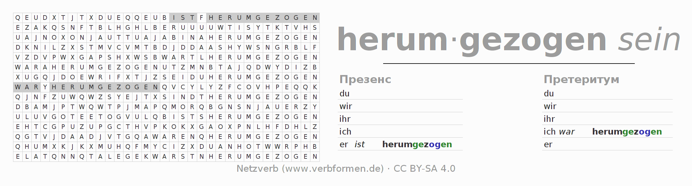 С помощью этих головоломок по поиску слов Вы можете подходящим для Вас способом изучать спряжение немецкого глагола herumziehen.