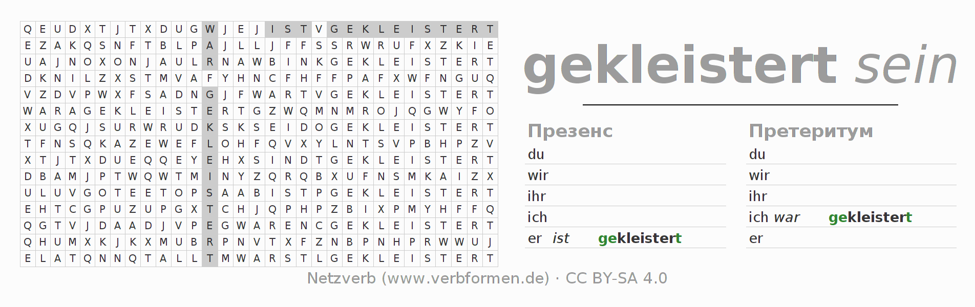 С помощью этих головоломок по поиску слов Вы можете подходящим для Вас способом изучать спряжение немецкого глагола kleistern.
