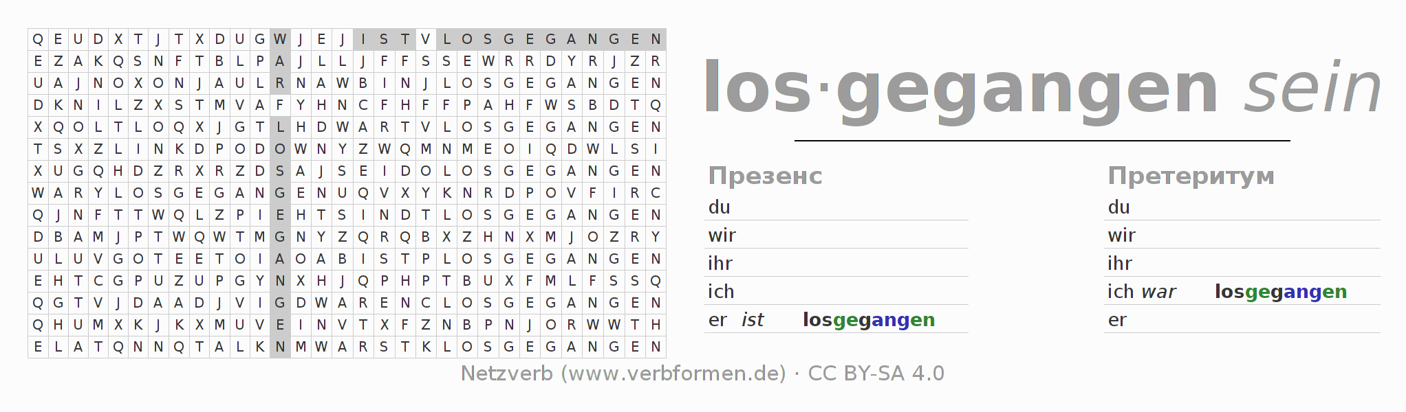 Рабочие материалы служат обучением спряжениям глагола losgehen на уроке и при самообучении. Рабочие материалы могут быть свободно использованы в рамках лицензии CC BY-SA 4.0 в виде Открытых образовательных ресурсов(ООР) например могут быть бесплатно использованы на уроке. Для этого имеется много различных типов рабочих материалов для глагола losgehen в наличии. Это таблицы спряжений, головоломки и игры. Весь учебный материал доступен бесплатно как файлы PDF, в виде изображений или как интерактивная версия браузера. В дополнение к задачам, имеются бесчисленные примеры для losgehen а также помощь в использовании глаголов.