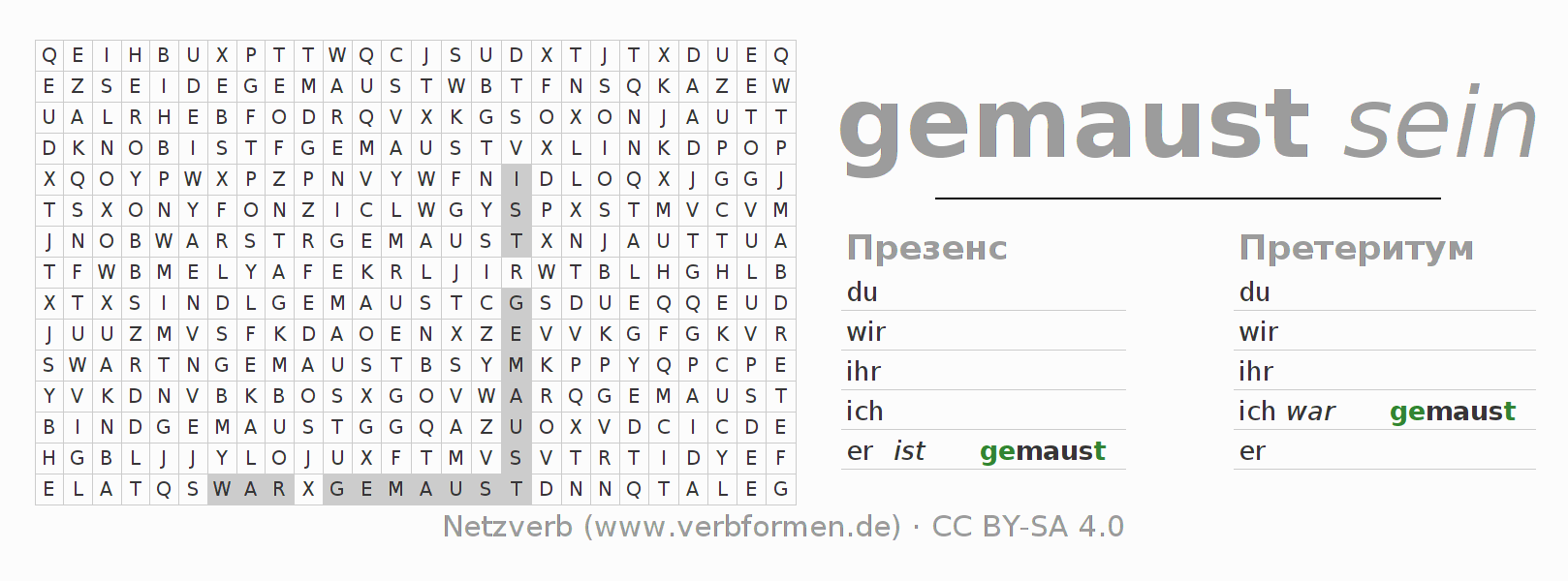 С помощью этих головоломок по поиску слов Вы можете подходящим для Вас способом изучать спряжение немецкого глагола mausen.