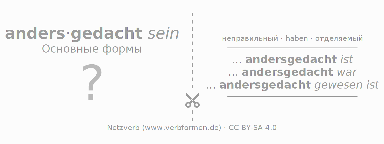 Глагольные таблицы, содержащие все формы глагола andersdenken, для наглядности объединены в одну общую таблицу.
