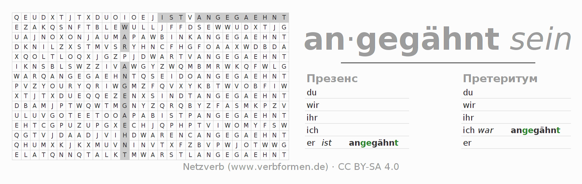 С помощью этих головоломок по поиску слов Вы можете подходящим для Вас способом изучать спряжение немецкого глагола angähnen.