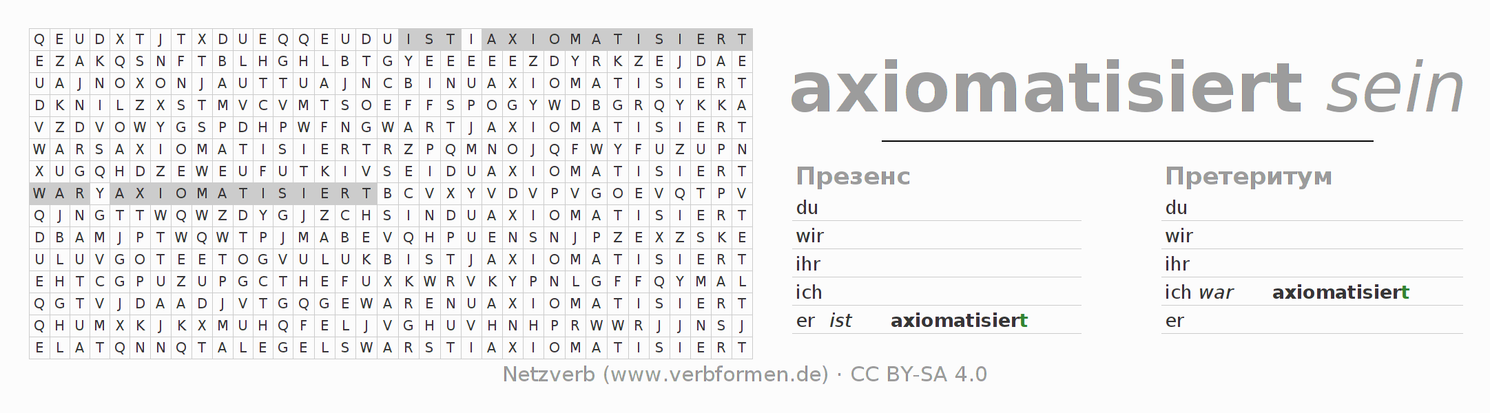 С помощью этих головоломок по поиску слов Вы можете подходящим для Вас способом изучать спряжение немецкого глагола axiomatisieren.