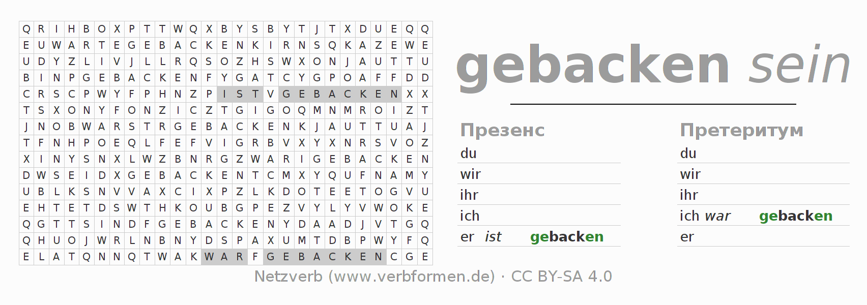 С помощью этих головоломок по поиску слов Вы можете подходящим для Вас способом изучать спряжение немецкого глагола backen.