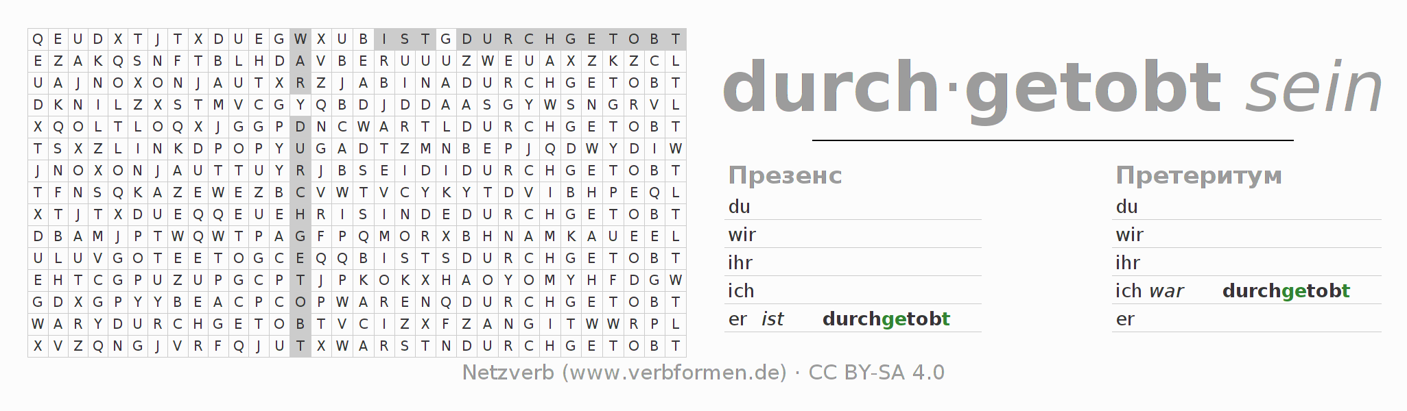 С помощью этих головоломок по поиску слов Вы можете подходящим для Вас способом изучать спряжение немецкого глагола durchtoben.
