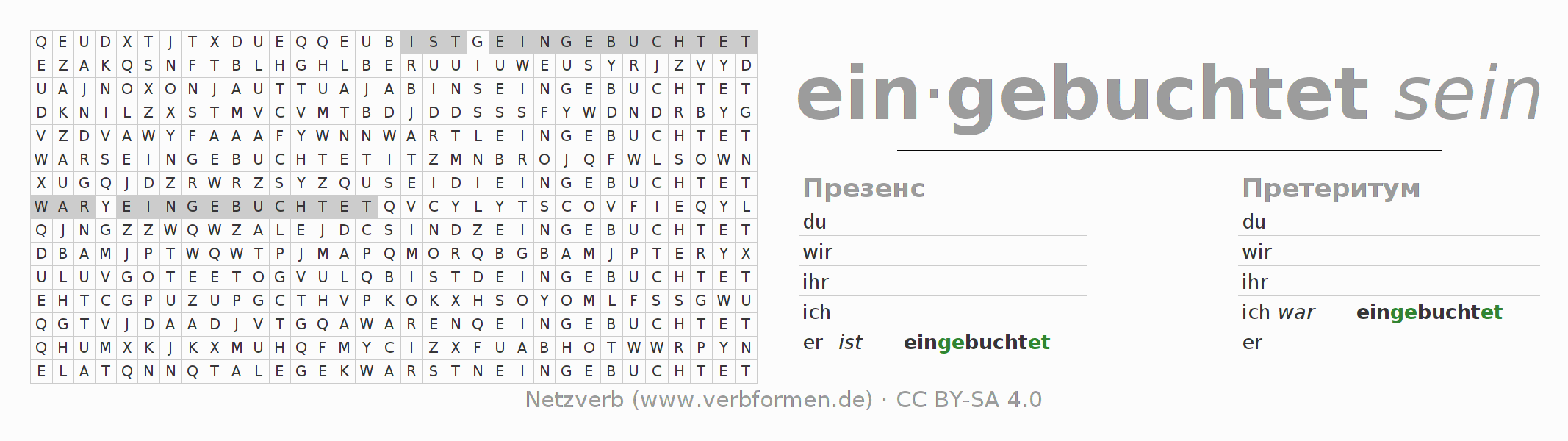 С помощью этих головоломок по поиску слов Вы можете подходящим для Вас способом изучать спряжение немецкого глагола einbuchten.