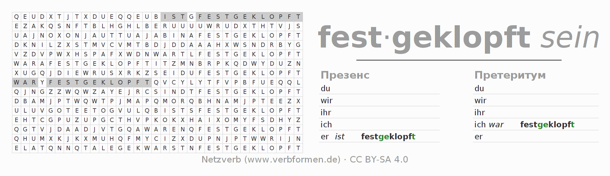 Рабочие материалы служат обучением спряжениям глагола festklopfen на уроке и при самообучении. Рабочие материалы могут быть свободно использованы в рамках лицензии CC BY-SA 4.0 в виде Открытых образовательных ресурсов(ООР) например могут быть бесплатно использованы на уроке. Для этого имеется много различных типов рабочих материалов для глагола festklopfen в наличии. Это таблицы спряжений, головоломки и игры. Весь учебный материал доступен бесплатно как файлы PDF, в виде изображений или как интерактивная версия браузера. В дополнение к задачам, имеются бесчисленные примеры для festklopfen а также помощь в использовании глаголов.