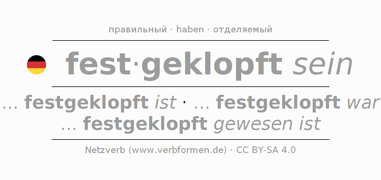 Глагольные таблицы, содержащие все формы глагола festklopfen, для наглядности объединены в одну общую таблицу.