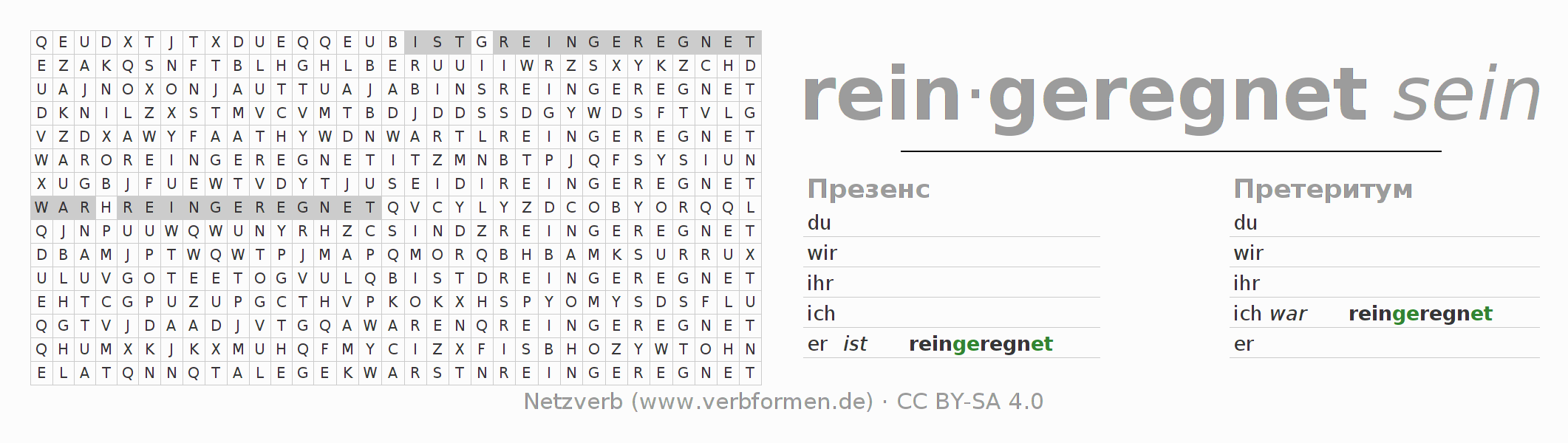 Глагольные таблицы, содержащие все формы глагола reinregnen, для наглядности объединены в одну общую таблицу.