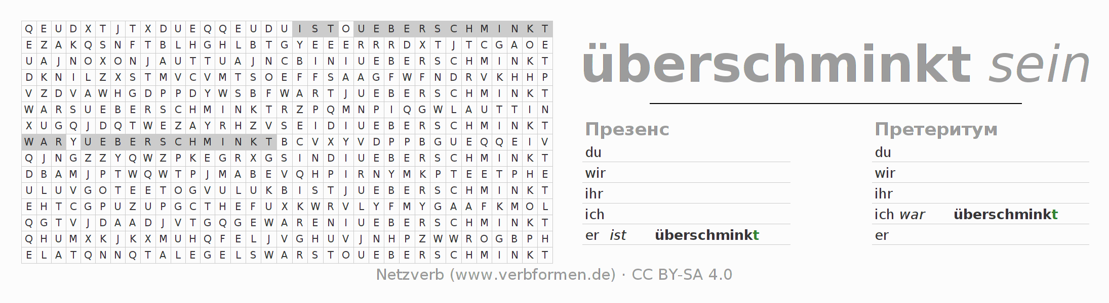 С помощью этих головоломок по поиску слов Вы можете подходящим для Вас способом изучать спряжение немецкого глагола überschminken.