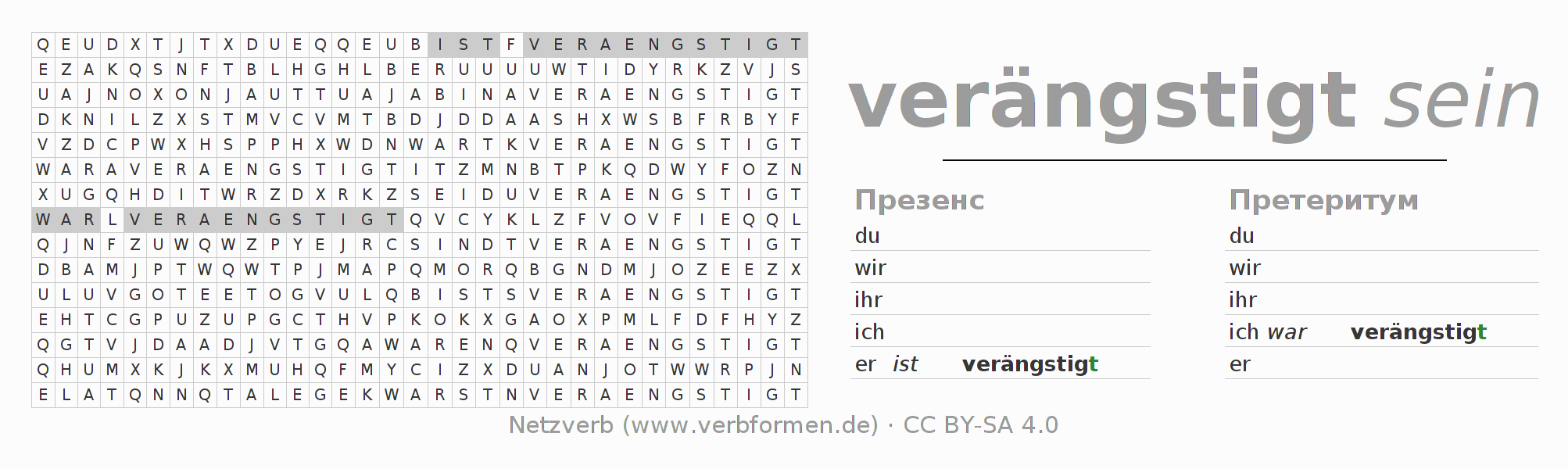 Рабочие материалы служат обучением спряжениям глагола verängstigen на уроке и при самообучении. Рабочие материалы могут быть свободно использованы в рамках лицензии CC BY-SA 4.0 в виде Открытых образовательных ресурсов(ООР) например могут быть бесплатно использованы на уроке. Для этого имеется много различных типов рабочих материалов для глагола verängstigen в наличии. Это таблицы спряжений, головоломки и игры. Весь учебный материал доступен бесплатно как файлы PDF, в виде изображений или как интерактивная версия браузера. В дополнение к задачам, имеются бесчисленные примеры для verängstigen а также помощь в использовании глаголов.