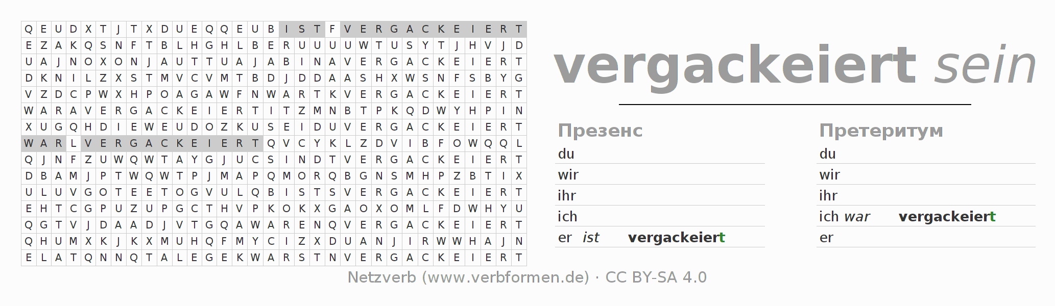 Глагольные таблицы, содержащие все формы глагола vergackeiern, для наглядности объединены в одну общую таблицу.