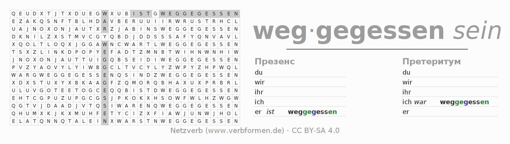 Рабочие материалы служат обучением спряжениям глагола wegessen на уроке и при самообучении. Рабочие материалы могут быть свободно использованы в рамках лицензии CC BY-SA 4.0 в виде Открытых образовательных ресурсов(ООР) например могут быть бесплатно использованы на уроке. Для этого имеется много различных типов рабочих материалов для глагола wegessen в наличии. Это таблицы спряжений, головоломки и игры. Весь учебный материал доступен бесплатно как файлы PDF, в виде изображений или как интерактивная версия браузера. В дополнение к задачам, имеются бесчисленные примеры для wegessen а также помощь в использовании глаголов.