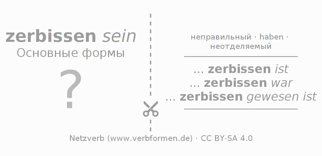 Глагольные таблицы, содержащие все формы глагола zerbeißen, для наглядности объединены в одну общую таблицу.