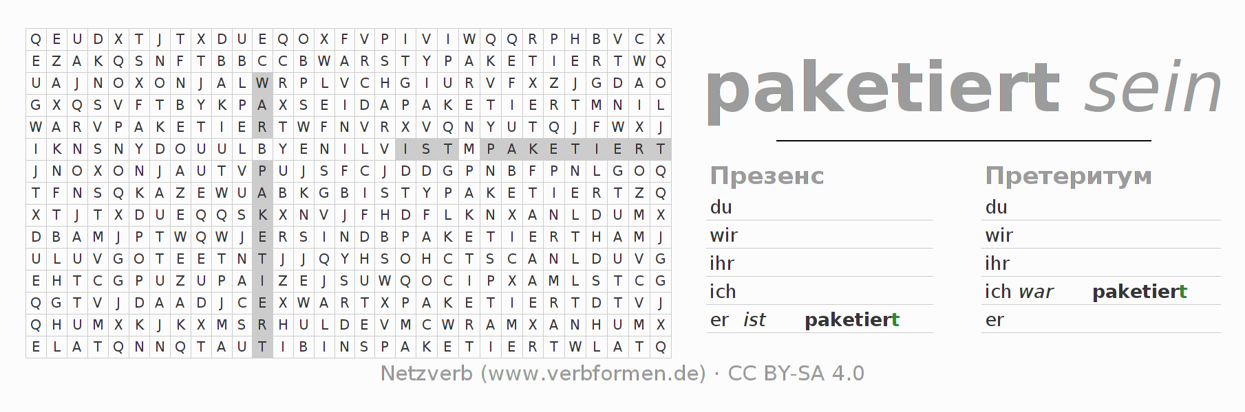 С помощью этих головоломок по поиску слов Вы можете подходящим для Вас способом изучать спряжение немецкого глагола paketieren.
