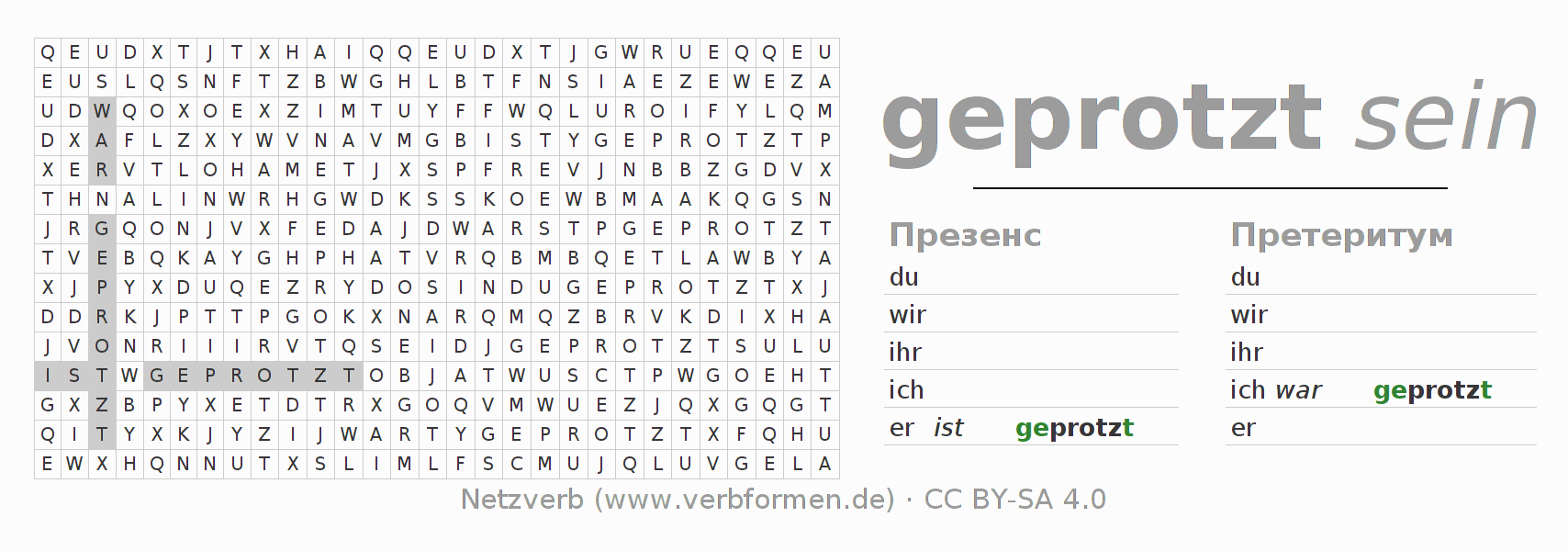 С помощью этих головоломок по поиску слов Вы можете подходящим для Вас способом изучать спряжение немецкого глагола protzen.