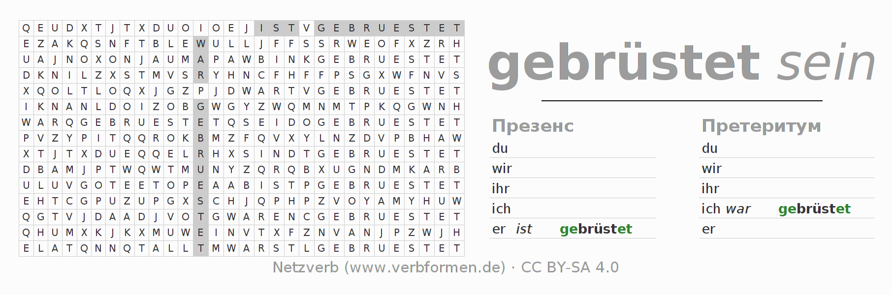 Рабочие материалы служат обучением спряжениям глагола brüsten на уроке и при самообучении. Рабочие материалы могут быть свободно использованы в рамках лицензии CC BY-SA 4.0 в виде Открытых образовательных ресурсов(ООР) например могут быть бесплатно использованы на уроке. Для этого имеется много различных типов рабочих материалов для глагола sich brüsten в наличии. Это таблицы спряжений, головоломки и игры. Весь учебный материал доступен бесплатно как файлы PDF, в виде изображений или как интерактивная версия браузера. В дополнение к задачам, имеются бесчисленные примеры для brüsten а также помощь в использовании глаголов.