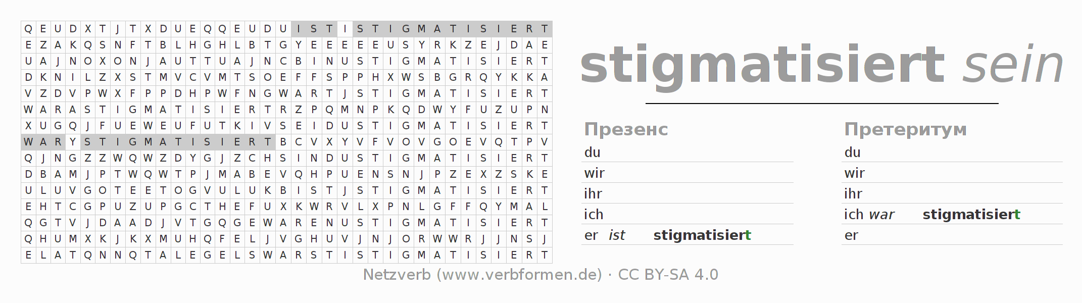 С помощью этих головоломок по поиску слов Вы можете подходящим для Вас способом изучать спряжение немецкого глагола stigmatisieren.