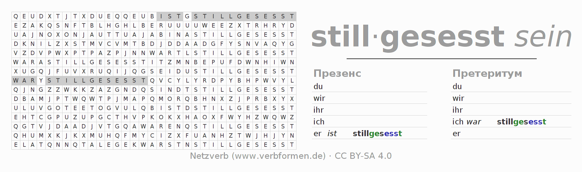Глагольные таблицы, содержащие все формы глагола stillsitzen, для наглядности объединены в одну общую таблицу.