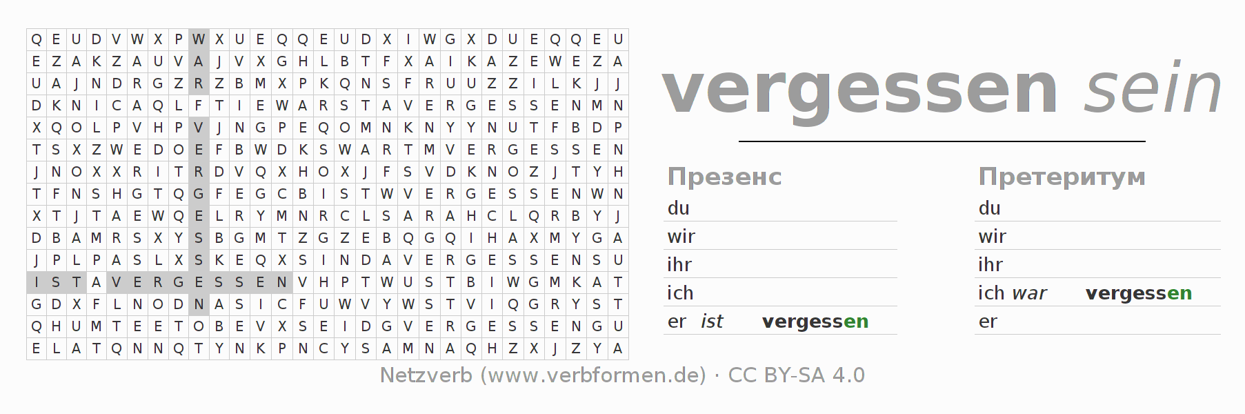 Рабочие материалы служат обучением спряжениям глагола vergessen на уроке и при самообучении. Рабочие материалы могут быть свободно использованы в рамках лицензии CC BY-SA 4.0 в виде Открытых образовательных ресурсов(ООР) например могут быть бесплатно использованы на уроке. Для этого имеется много различных типов рабочих материалов для глагола vergessen в наличии. Это таблицы спряжений, головоломки и игры. Весь учебный материал доступен бесплатно как файлы PDF, в виде изображений или как интерактивная версия браузера. В дополнение к задачам, имеются бесчисленные примеры для vergessen а также помощь в использовании глаголов.