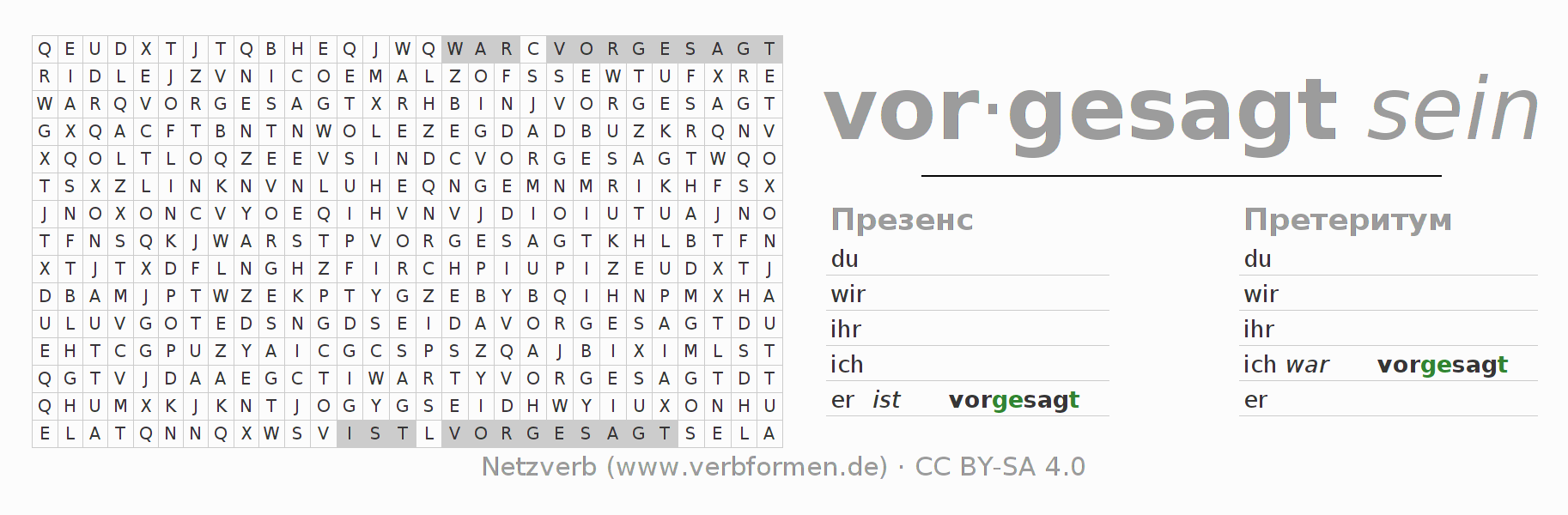 С помощью этих головоломок по поиску слов Вы можете подходящим для Вас способом изучать спряжение немецкого глагола vorsagen.