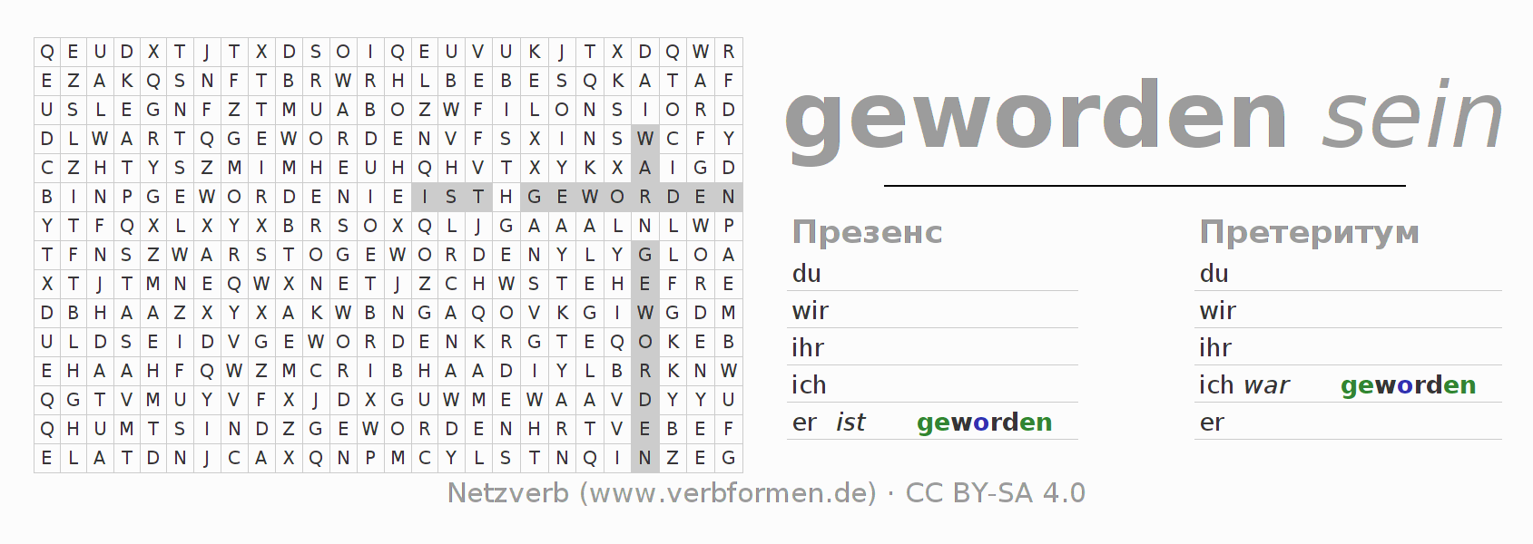 Рабочие материалы служат обучением спряжениям глагола werden на уроке и при самообучении. Рабочие материалы могут быть свободно использованы в рамках лицензии CC BY-SA 4.0 в виде Открытых образовательных ресурсов(ООР) например могут быть бесплатно использованы на уроке. Для этого имеется много различных типов рабочих материалов для глагола werden в наличии. Это таблицы спряжений, головоломки и игры. Весь учебный материал доступен бесплатно как файлы PDF, в виде изображений или как интерактивная версия браузера. В дополнение к задачам, имеются бесчисленные примеры для werden а также помощь в использовании глаголов.