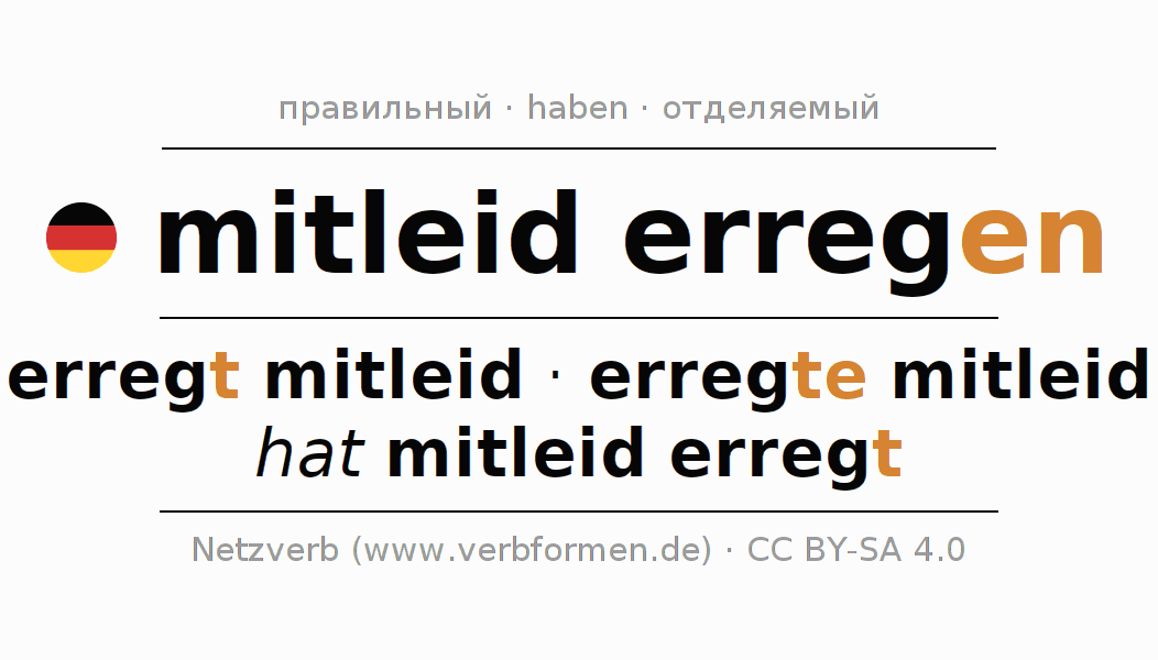 Глагол mitleiderregen спрягается в индикативе Действительный залог (актив) в настоящем, прошедшем и будущем времени