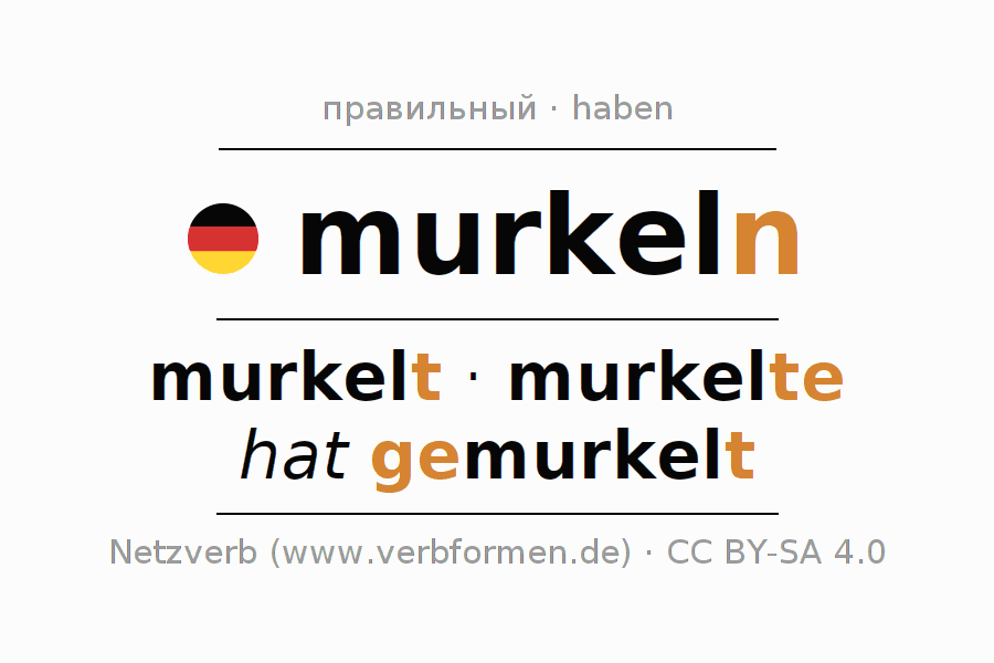 - Перфект: ich habe gemurkelt, du habest gemurkelt, er habe gemurkelt, wir haben gemurkelt, ihr habet gemurkelt, sie haben gemurkelt