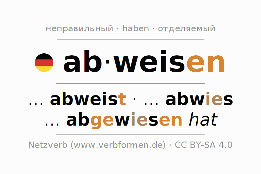 - Презенс: ... ich abweis(e), ... du abweist, ... er abweist, ... wir abweisen, ... ihr abweist, ... sie abweisen