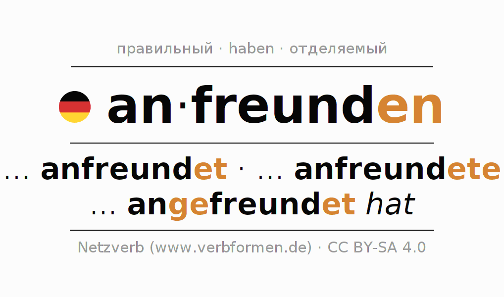 Спряжение глагола anfreunden (подружиться, привыкать) правильное. Формы глагола ... anfreundet, ... anfreundete, ... angefreundet hat. В качестве вспомогательного глагола к anfreunden употребляется "haben". Приставка an- для anfreunden отделяемая. Склоняется в Действительный залог (актив) и употребляется в Придаточное предложение. Для лучшего понимания приводится большое количество примеров употребления глагола anfreunden. Для тренировки и закрепления навыков имеются также бесплатные рабочие листы по anfreunden. Можно не только anfreunden спрягать, но и все немецкие глаголы. Глагол включён в словарный запас обладателя сертификата знания немецкого языка уровня B2. Kомментарии ☆