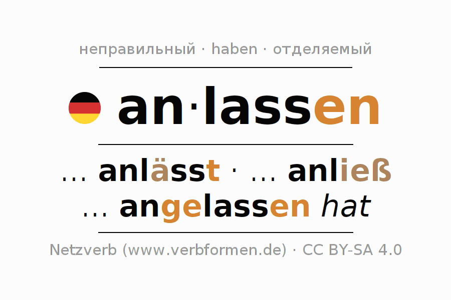 Спряжение глагола anlassen (не снимать, завести) неправильное. Формы глагола ... anlässt, ... anließ, ... angelassen hat. Чередующиеся гласные a - ie - a в корне: В качестве вспомогательного глагола к anlassen употребляется "haben". Глагол anlassen может употребляться в возвратной форме. Приставка an- для anlassen отделяемая. Склоняется в Действительный залог (актив) и употребляется в Придаточное предложение. Для лучшего понимания приводится большое количество примеров употребления глагола anlassen. Для тренировки и закрепления навыков имеются также бесплатные рабочие листы по anlassen. Можно не только anlassen спрягать, но и все немецкие глаголы. Глагол включён в словарный запас обладателя сертификата знания немецкого языка уровня A2. Kомментарии ☆