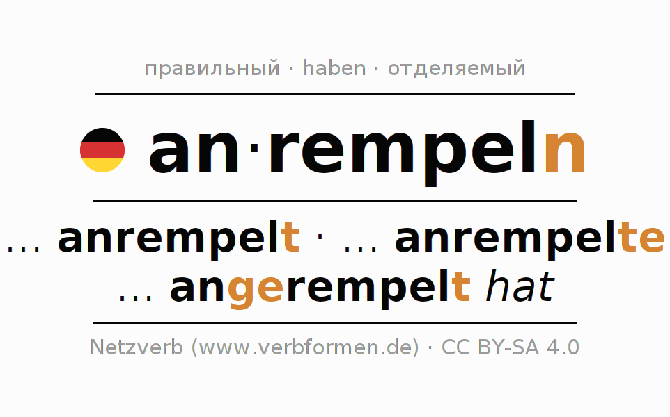 - Презенс: remp(e)l(e) (du) an, rempeln wir an, rempelt (ihr) an, rempeln Sie an