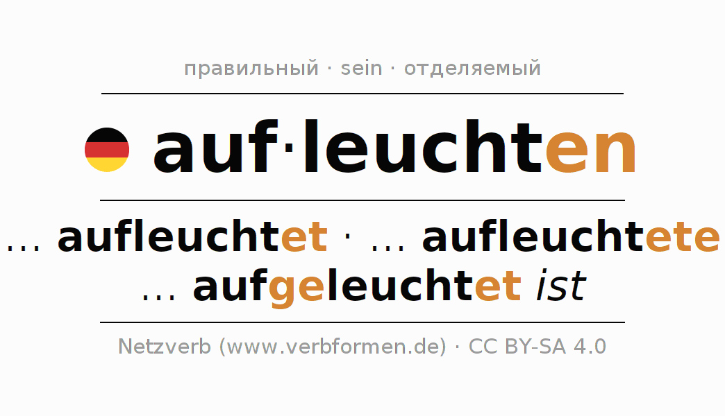 Спряжение глагола aufleuchten (вспыхивать, вспыхнуть) правильное. Формы глагола ... aufleuchtet, ... aufleuchtete, ... aufgeleuchtet ist. В качестве вспомогательного глагола к aufleuchten употребляется "sein". Однако имеются временные формы со вспомогательным глаголом haben. Приставка auf- для aufleuchten отделяемая. Склоняется в Действительный залог (актив) и употребляется в Придаточное предложение. Для лучшего понимания приводится большое количество примеров употребления глагола aufleuchten. Для тренировки и закрепления навыков имеются также бесплатные рабочие листы по aufleuchten. Можно не только aufleuchten спрягать, но и все немецкие глаголы. Глагол включён в словарный запас обладателя сертификата знания немецкого языка уровня C1. Kомментарии ☆