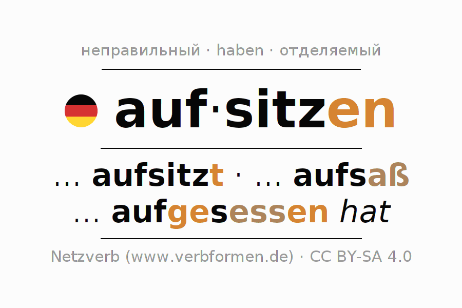 - Презенс: sitz(e) (du) auf, sitzen wir auf, sitzt (ihr) auf, sitzen Sie auf