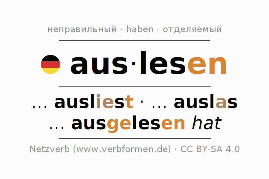 - Презенс: lies (du) aus, lesen wir aus, lest (ihr) aus, lesen Sie aus